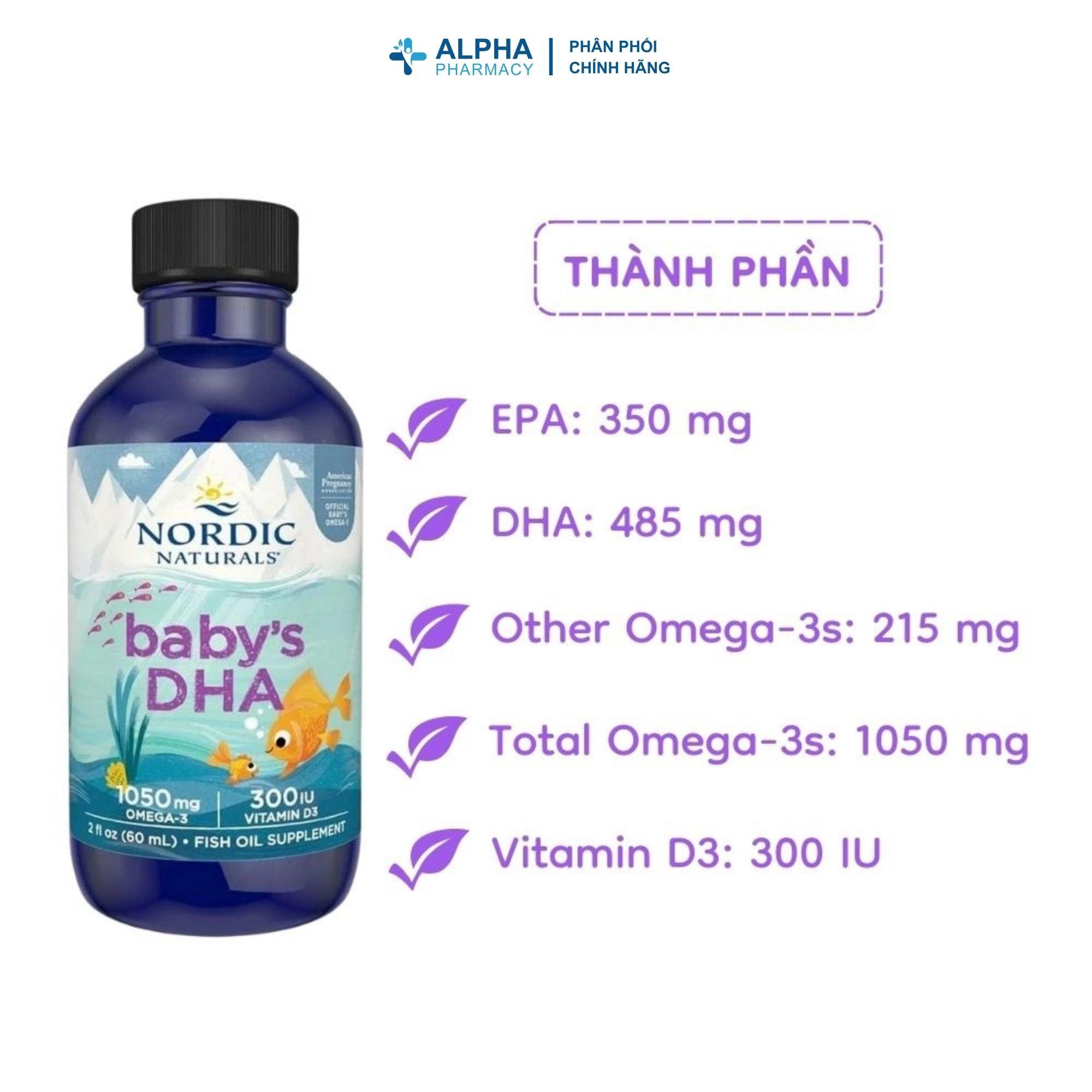 Mỗi chai Baby’s DHA Omega-3 With Vitamin D3 Nordic Naturals 60ml, chứa: