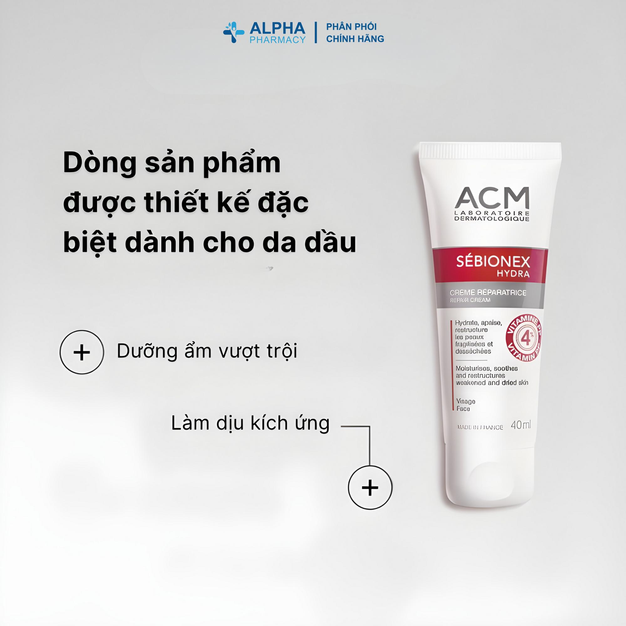 ACM Sebionex Hydra Repair Cream là giải pháp cứu cánh cho làn da mụn đang gặp phải tình trạng khô căng, bong tróc, nhạy cảm quá mức do sử dụng các hoạt chất trị mụn mạnh (như Retinoids, Benzoyl Peroxide) hoặc sau các liệu trình da liễu. Với công thức giàu thành phần dưỡng ẩm, phục hồi hàng rào bảo vệ da, sản phẩm giúp lấy lại sự thoải mái, mềm mại và khỏe mạnh cho làn da bị tổn thương.