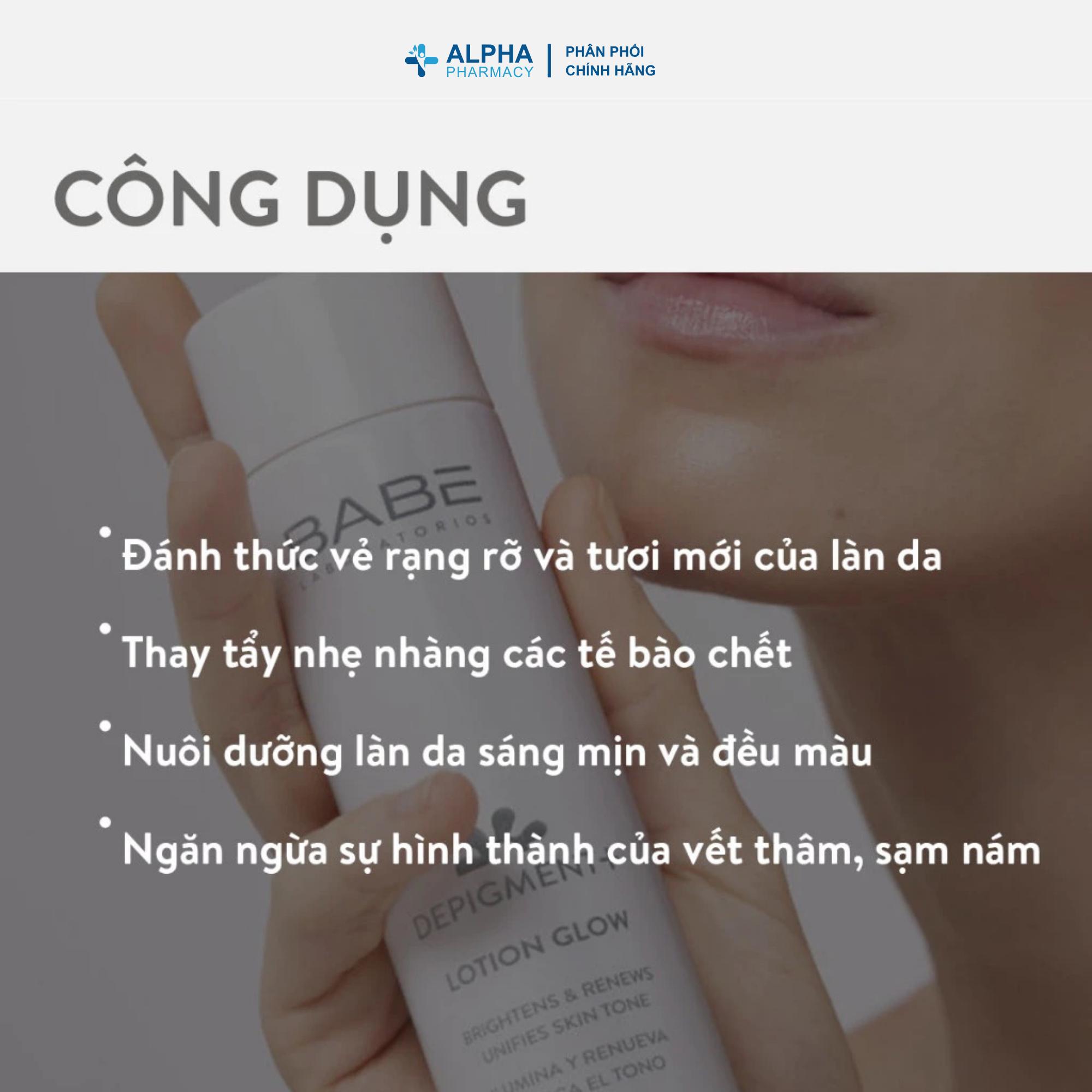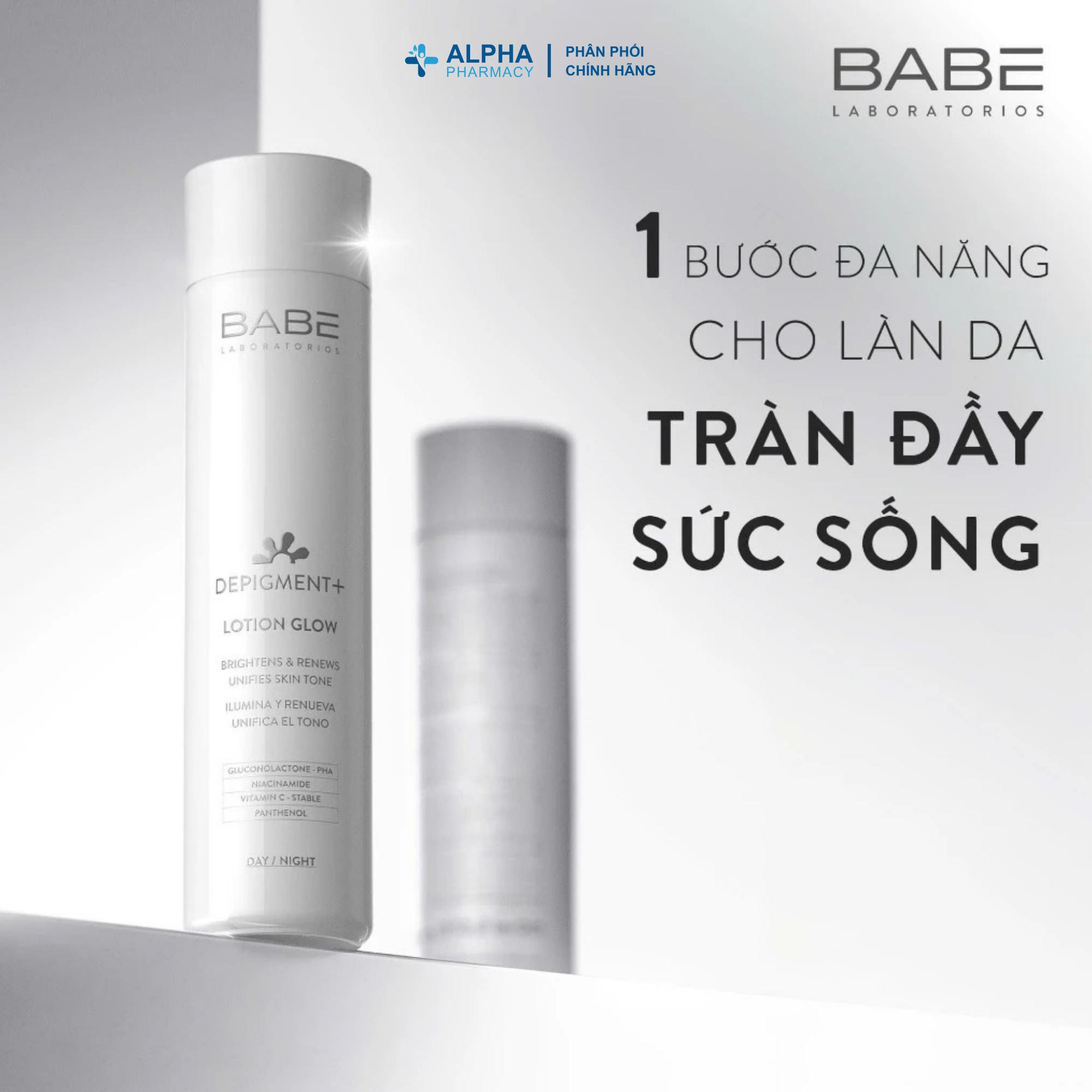 Babé Depigment+ Lotion Glow là lotion dưỡng thể giúp làm sáng da và cải thiện các vùng da tối màu, không đều màu do nám, thâm sau mụn hoặc tác động từ ánh nắng. Với kết cấu nhẹ, dễ thẩm thấu, sản phẩm mang lại cảm giác mềm mại, ẩm mịn mà không gây nhờn rít. Công thức chứa các hoạt chất làm sáng và chống oxy hóa giúp ức chế quá trình hình thành melanin, làm mờ đốm nâu, đồng thời phục hồi độ rạng rỡ tự nhiên cho làn da.