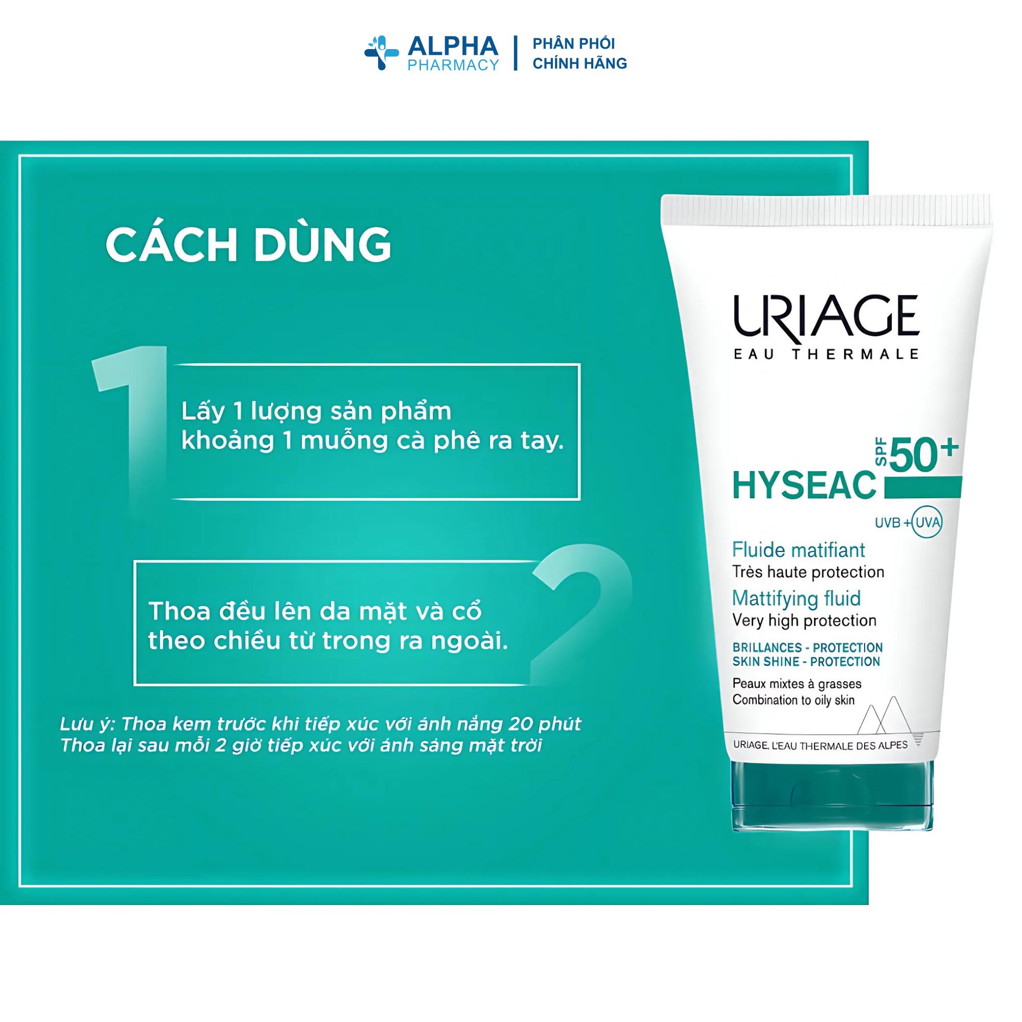 Sữa Chống Nắng Uriage Hyseac SPF50+ Fluide Mat (50ml) là kem chống nắng chuyên biệt dành cho da hỗn hợp đến da dầu, da mụn, được phát triển bởi thương hiệu dược mỹ phẩm Uriage từ Pháp. Đây là sản phẩm hoàn hảo giúp bảo vệ da tối ưu khỏi tác hại của tia UVA/UVB, đồng thời kiểm soát bã nhờn, giảm bóng dầu và hỗ trợ ngăn ngừa mụn, mang lại làn da mịn màng, khô thoáng và được bảo vệ toàn diện suốt cả ngày.