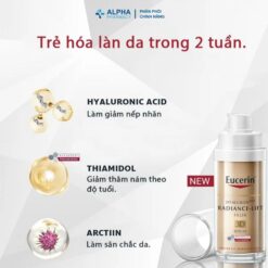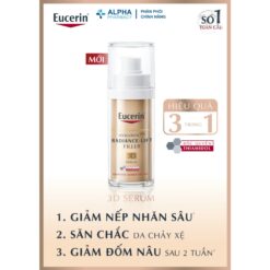 Serum Eucerin Hyaluron Radiance Lift Filler 3D 30ml là serum giúp cải thiện các vấn đề lão hoá da, giảm nếp nhăn sâu, giúp săn chắc da chảy xệ và giảm đốm nâu sau 2 tuần nhờ chứa Hyaluronic Acid cùng 2 thành phần độc quyền từ nhà Eucerin: Arctiin và Thiamidol giúp cấp ẩm sâu, kích thích sản sinh collagen cho da săn chắc hơn đồng thời ức chế sản sinh melanin gây sạm màu da.