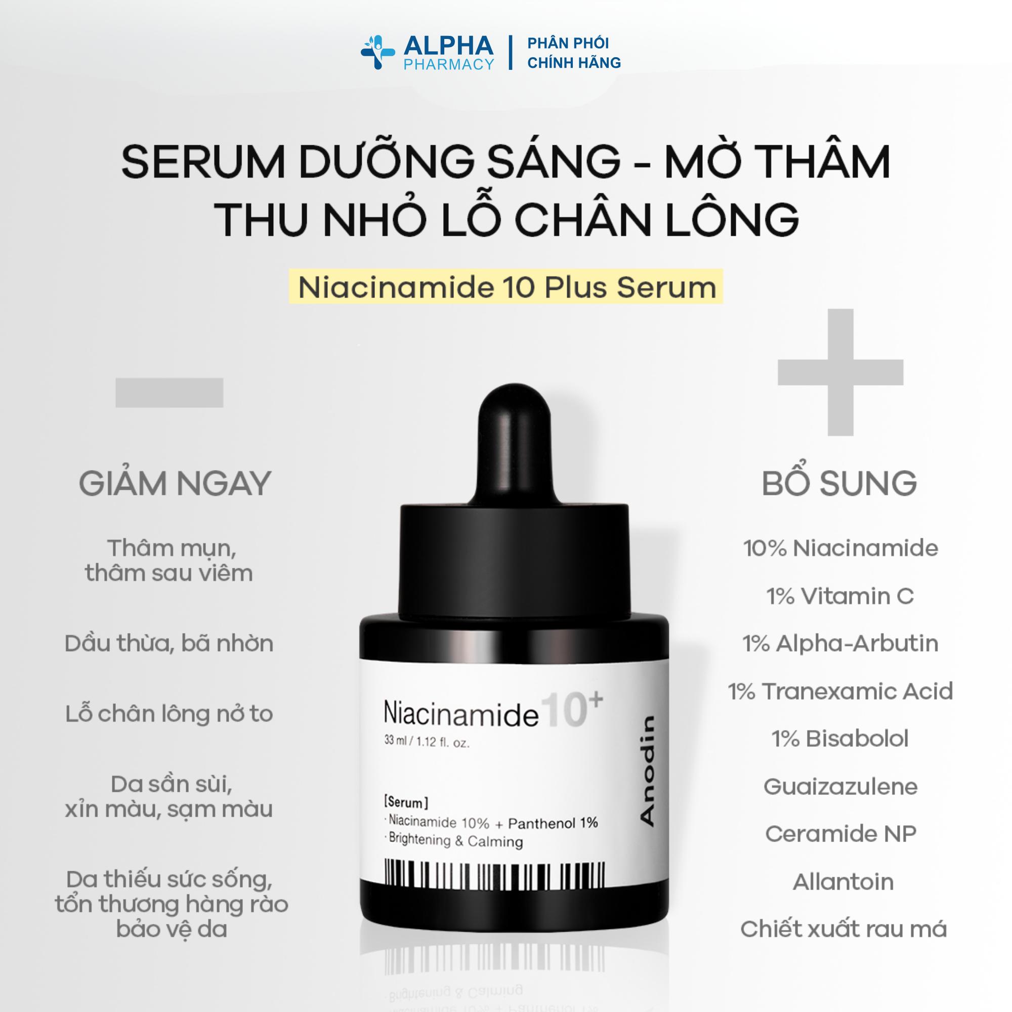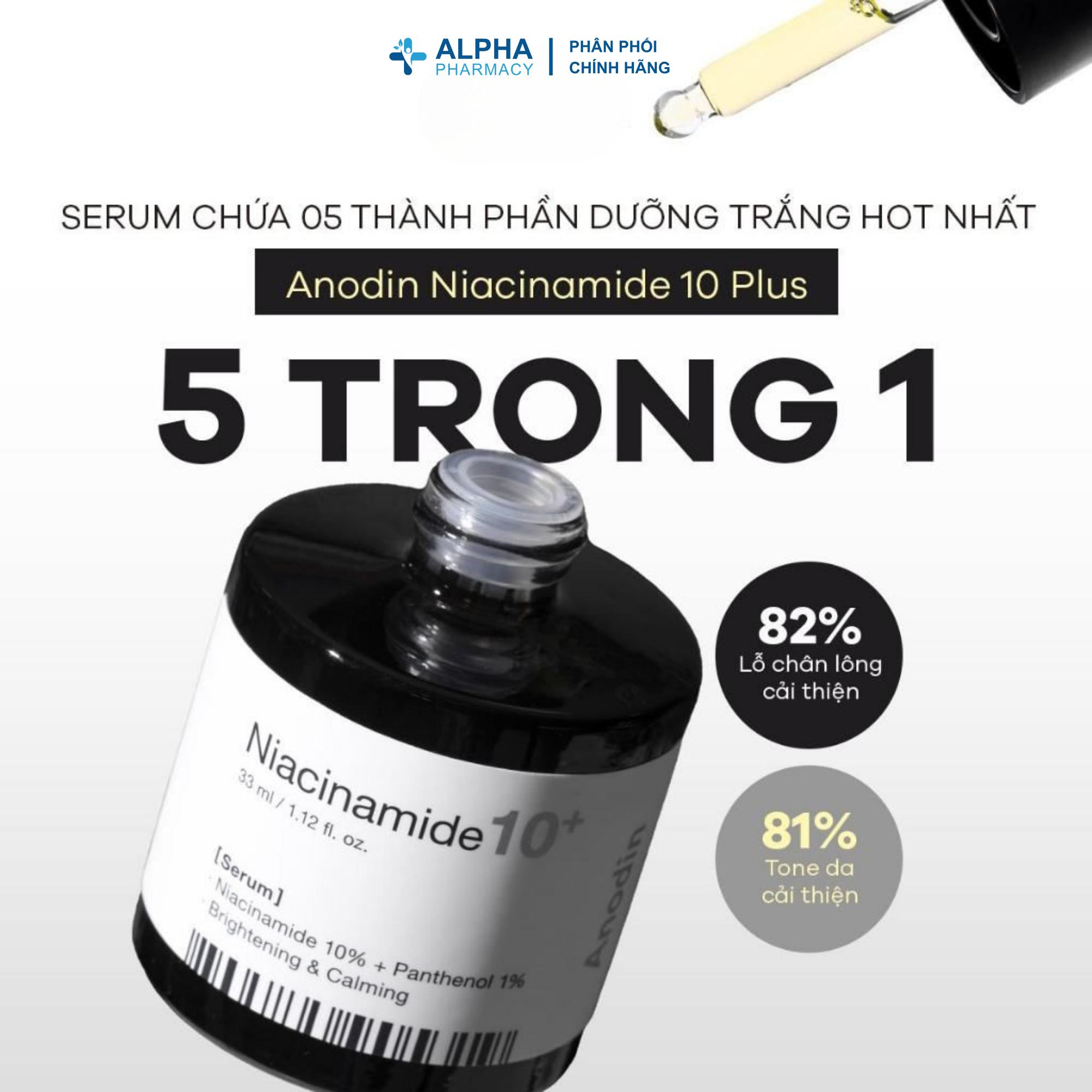 Tinh Chất Serum Niacinamide Anodin là một sản phẩm dưỡng da đột phá, được bào chế đặc biệt để làm sáng da, làm mờ các vết thâm, đốm nâu và phục hồi hàng rào bảo vệ da. Với thành phần chính là Niacinamide, một hoạt chất “vàng” trong ngành mỹ phẩm, sản phẩm này mang đến giải pháp toàn diện cho làn da không đều màu, xỉn màu và có lỗ chân lông to.