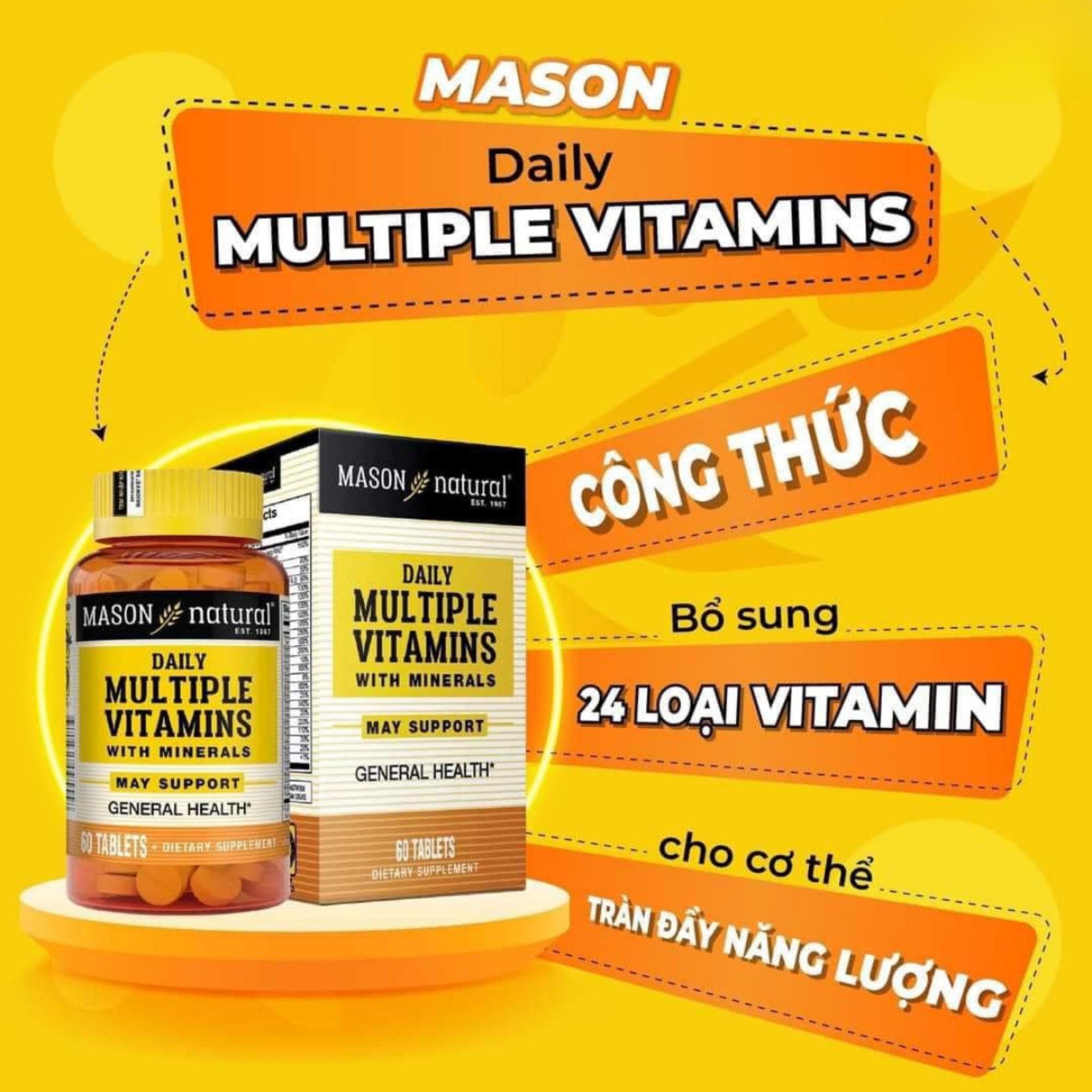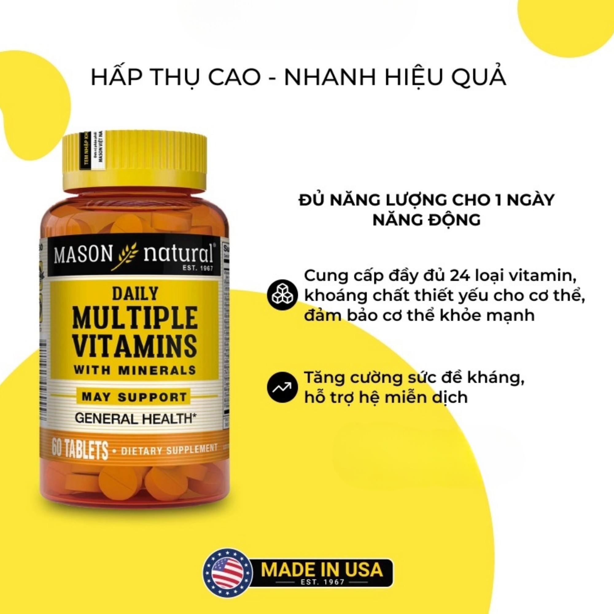Viên uống vitamin tổng hợp Mason Natural Daily Multiple Vitamins With Minerals cung cấp đến 24 loại vitamin và khoáng chất thiết yếu cho cơ thể, nhờ vậy có thể hỗ trợ nâng cao sức khỏe toàn diện mỗi ngày. Sản phẩm đặc biệt rất lành tính, dùng được cho đa dạng đối tượng, kể cả phụ nữ mang thai hoặc đang cho bé bú.