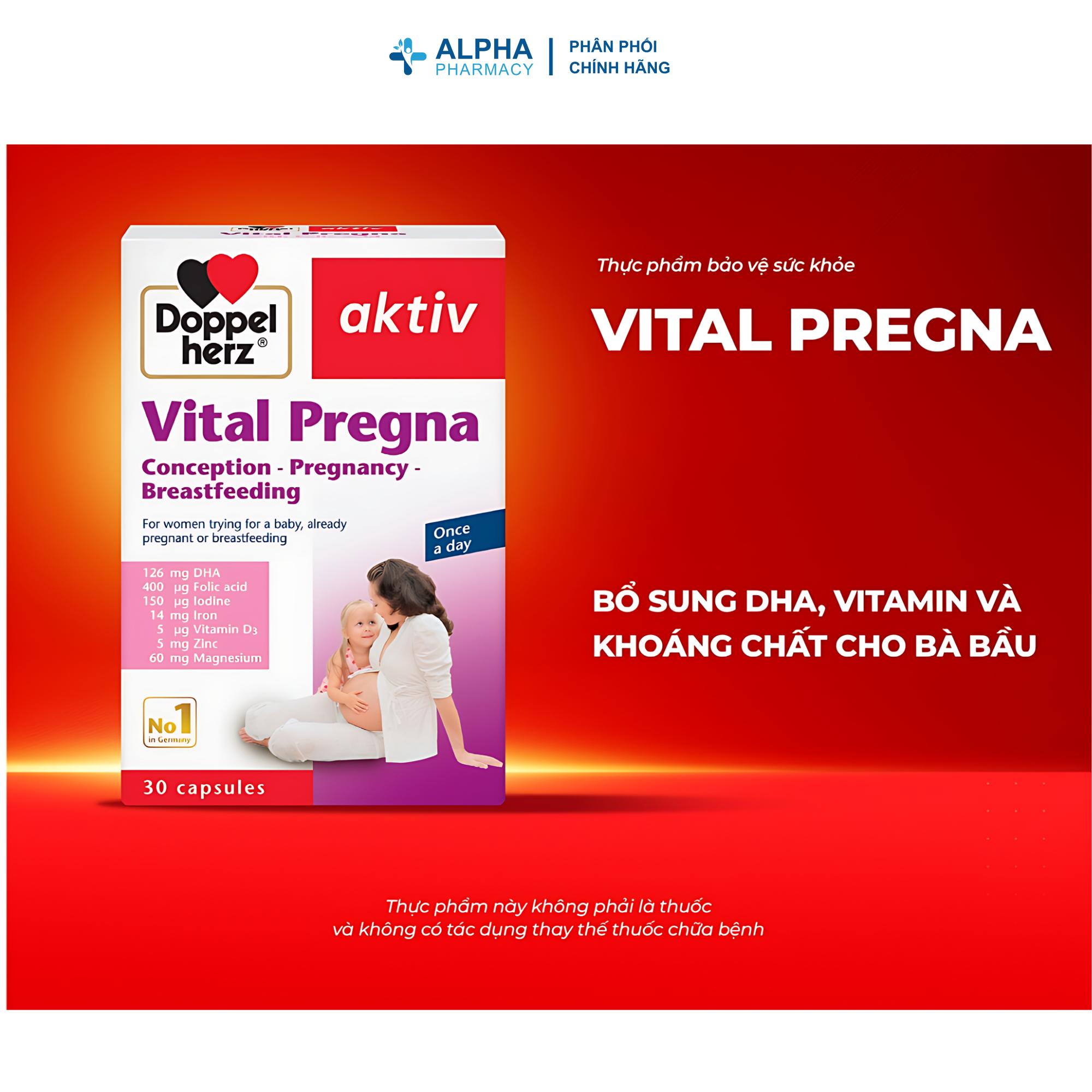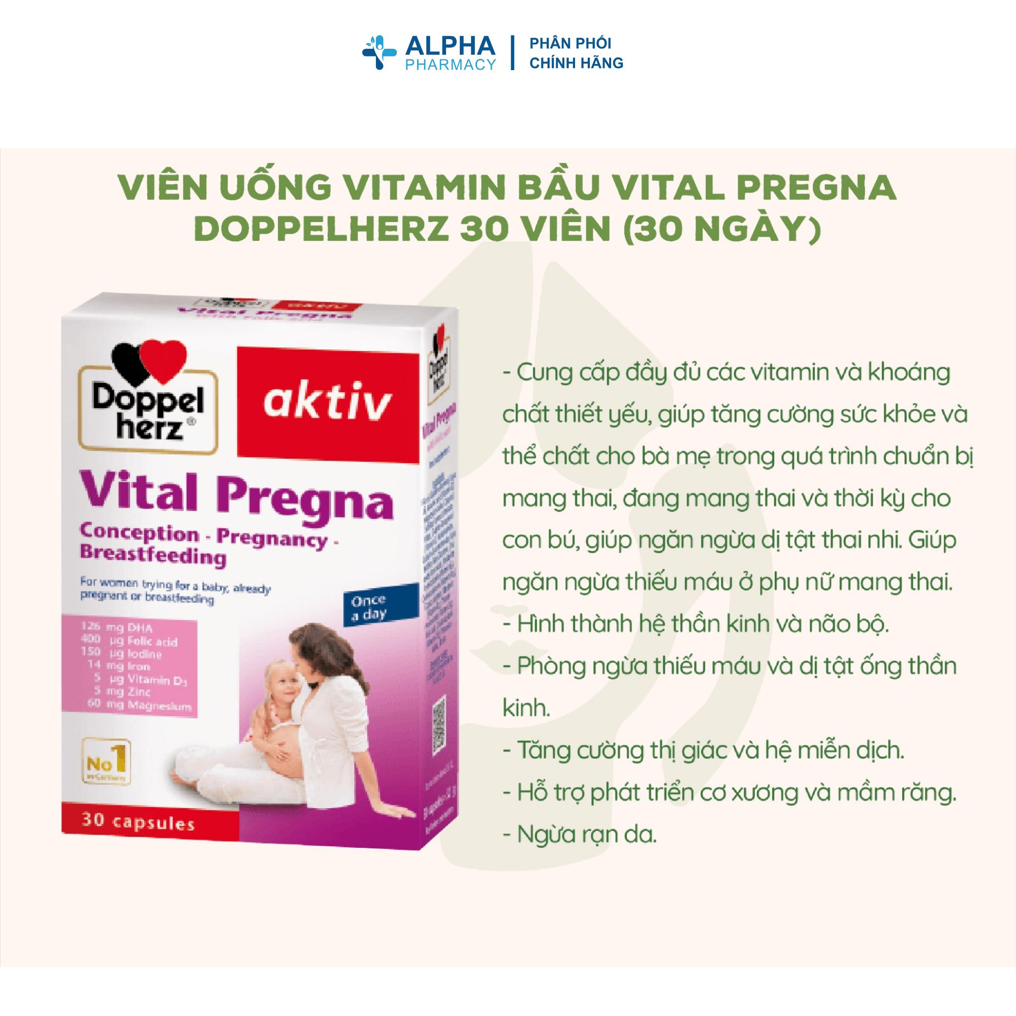 Viên Uống Doppelherz Vital Pregna là một sản phẩm bổ sung chuyên biệt, được thiết kế với công thức toàn diện và cân bằng nhằm cung cấp đầy đủ vitamin và khoáng chất thiết yếu cho phụ nữ trong suốt giai đoạn mang thai và cho con bú. Sản phẩm là sự kết hợp của những dưỡng chất quan trọng nhất như Axit Folic, Sắt, DHA, I-ốt cùng nhiều vitamin và khoáng chất khác, mang lại hiệu quả vượt trội trong việc đảm bảo sự phát triển khỏe mạnh của thai nhi và duy trì sức khỏe tốt cho mẹ. Với hộp 30 viên, đây là người bạn đồng hành không thể thiếu để cả mẹ và bé có một thai kỳ an toàn và khỏe mạnh.