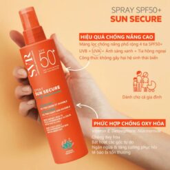 SVR Sun Secure Spray SPF50+ 200ML là kem chống nắng dạng xịt với kết cấu sữa siêu mịn, thấm nhanh, mang lại cảm giác khô thoáng cùng lớp nền vô hình trên da. Xịt chống nắng trong suốt, không gây nhờn, tiện lợi, giúp phân bổ đều sản phẩm, giúp bảo vệ da toàn diện trước ánh nắng mặt trời và mang lại trải nghiệm dễ dàng và thoải mái khi sử dụng. Xịt chống nắng Sun Secure Spray không cồn, không paraben, phù hợp với mọi loại da, kể cả da nhạy cảm. Đi kèm với hương thơm mùa hè dịu nhẹ, tạo cảm giác dễ chịu, khiến bạn muốn thoa lại nhiều lần.